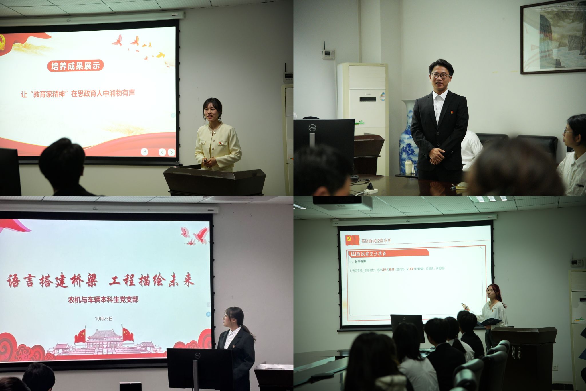 在交流环节,杨安琪同志和盖小菲同志先分别作了各自党支部的情况介绍。农机与车辆本科生党支部书记刘丹同志作“让教育家精神在思政育人中润物有声”交流分享,她以"2024届本科生党员杨敬升捐赠奖学金"为例,阐述了365上市公司(英国)集团在本科人才培养方面落实立德树人根本任务,特别是强化“教育家精神”在增强学生社会责任感和奉献精神中的一些做法,激励大家成为心怀感恩、挺膺担当的新时代青年表率。
