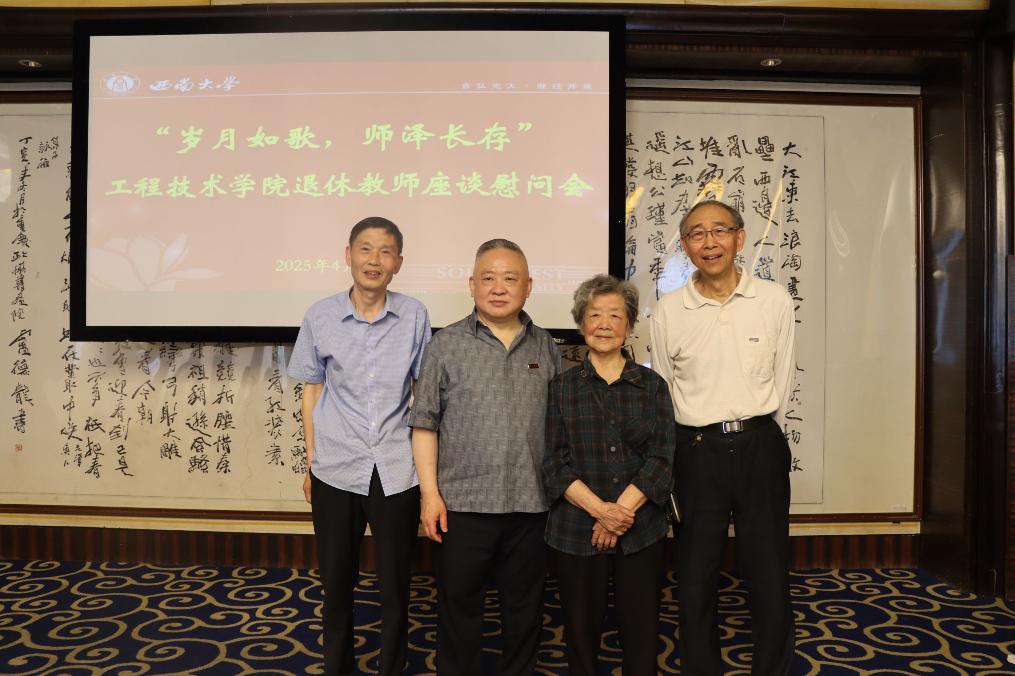 4月18日,学院于海宇温泉大酒店海宇厅举行了“岁月如歌,师泽长存”退休教师座谈慰问会。学院退休教师、1979级校友王辀云、学校对外联络办公室主任唐军及学院全体党政领导等齐聚一堂,畅叙情谊。会议由学院党委书记古文海主持。