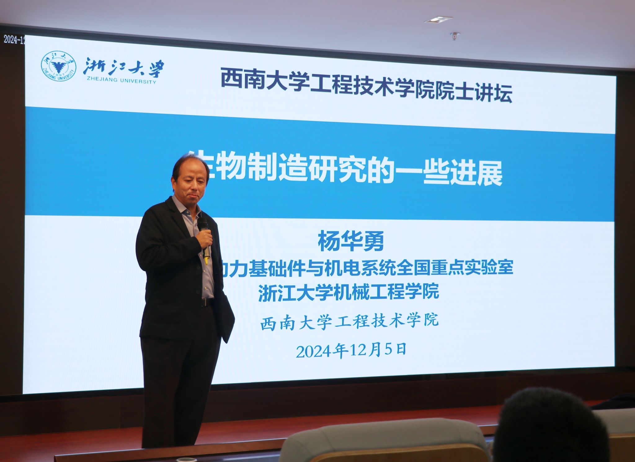 12月5日上午,中国工程院院士、浙江大学工学部主任杨华勇教授来院作讲座。学院党政领导、教师及研究生参与了本次讲座。讲座由院长谢守勇主持。