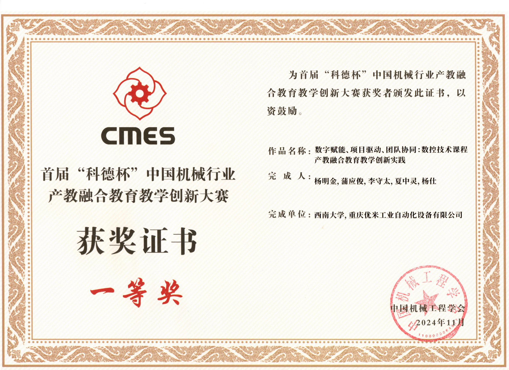 11月23日,首届“科德杯”中国机械行业产教融合教育教学创新大赛全国总决赛在浙江大学举行。学院杨明金教授团队作品《数字赋能、项目驱动、团队协同:数控技术课程产教融合教育教学创新实践》荣获全国赛区一等奖。何辉波副教授团队作品《质量引领、持续改进、评价反馈——机械专业人才培养质量保障体系构建与评价》获得西南赛区二等奖。
