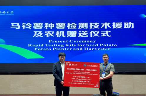 2023年5月25日,在学校举办的“‘一带一路’国际马铃薯产业发展合作论坛暨长江上游马铃薯种质创制与利用研讨会”上,学院院长谢守勇教授代表学院向哈萨克斯坦西哈萨克斯坦农业技术大学捐赠了2CMIF-2马铃薯播种机和4U-90马铃薯联合收获机,Adilet博士代表学校接受了捐赠,中国科学技术交流中心、农业农村部人力资源开发中心、重庆市科学技术局、重庆市农业农村委员会相关领导以及来自国际马铃薯中心亚太中心、中国种子协会马铃薯分会等单位的各位专家学者共同出席了捐赠仪式。