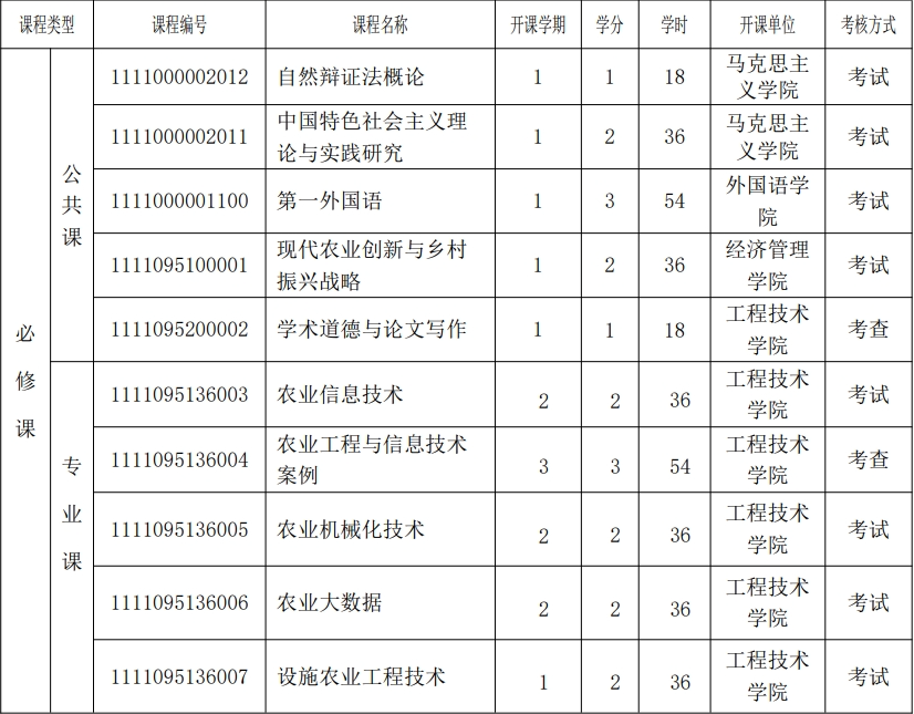攻读农业工程与信息技术领域(方向)农业硕士专业学位的研究生须完成以下课程的学习和必修环节,总学分应不少于28学分,其中全日制课程学分不少于22学分,实践训练6学分。